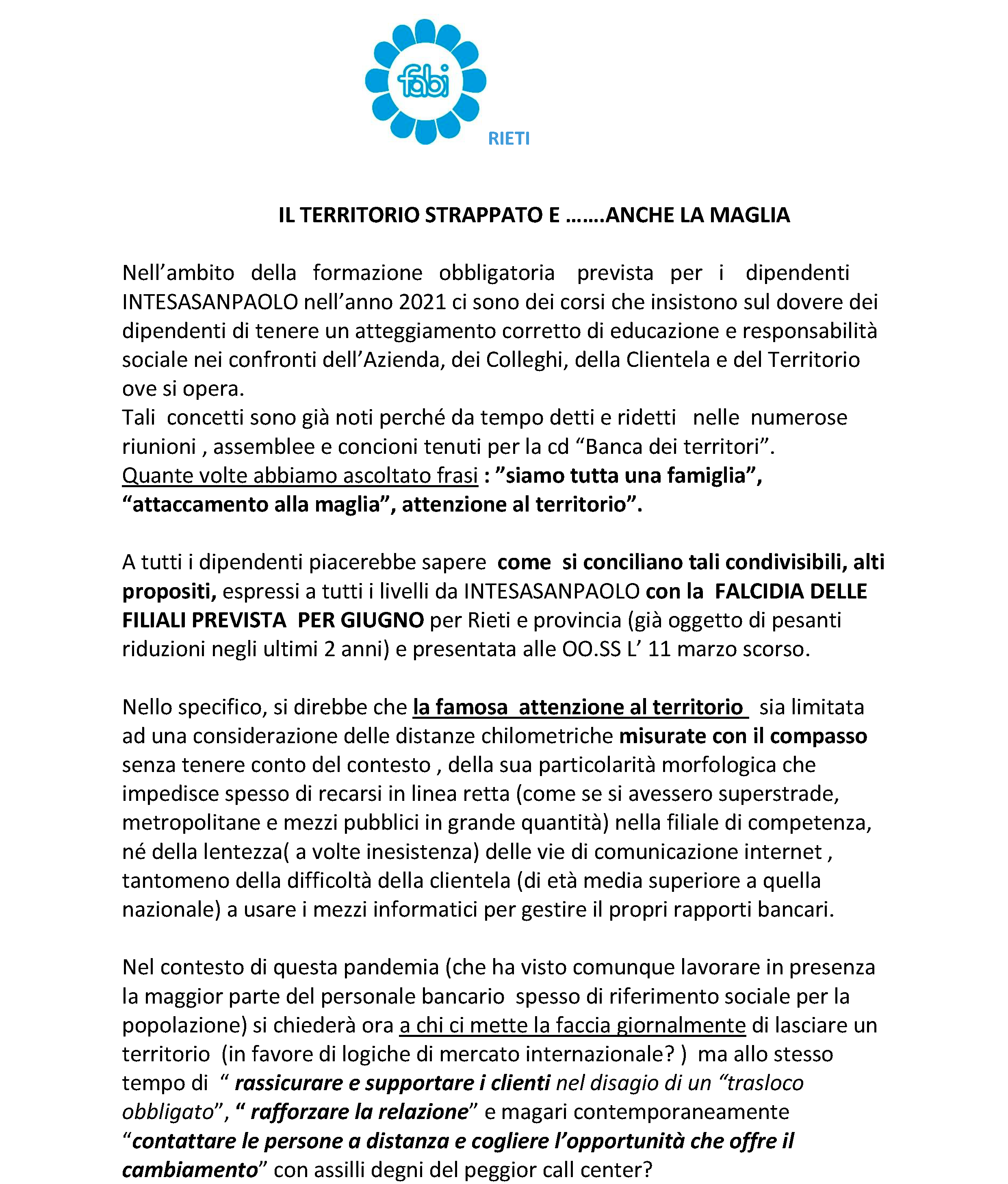 31 marzo 2021 FABI INTESASANPAOLO RIETI SEGRETERIA PROVINCIALE RIETI