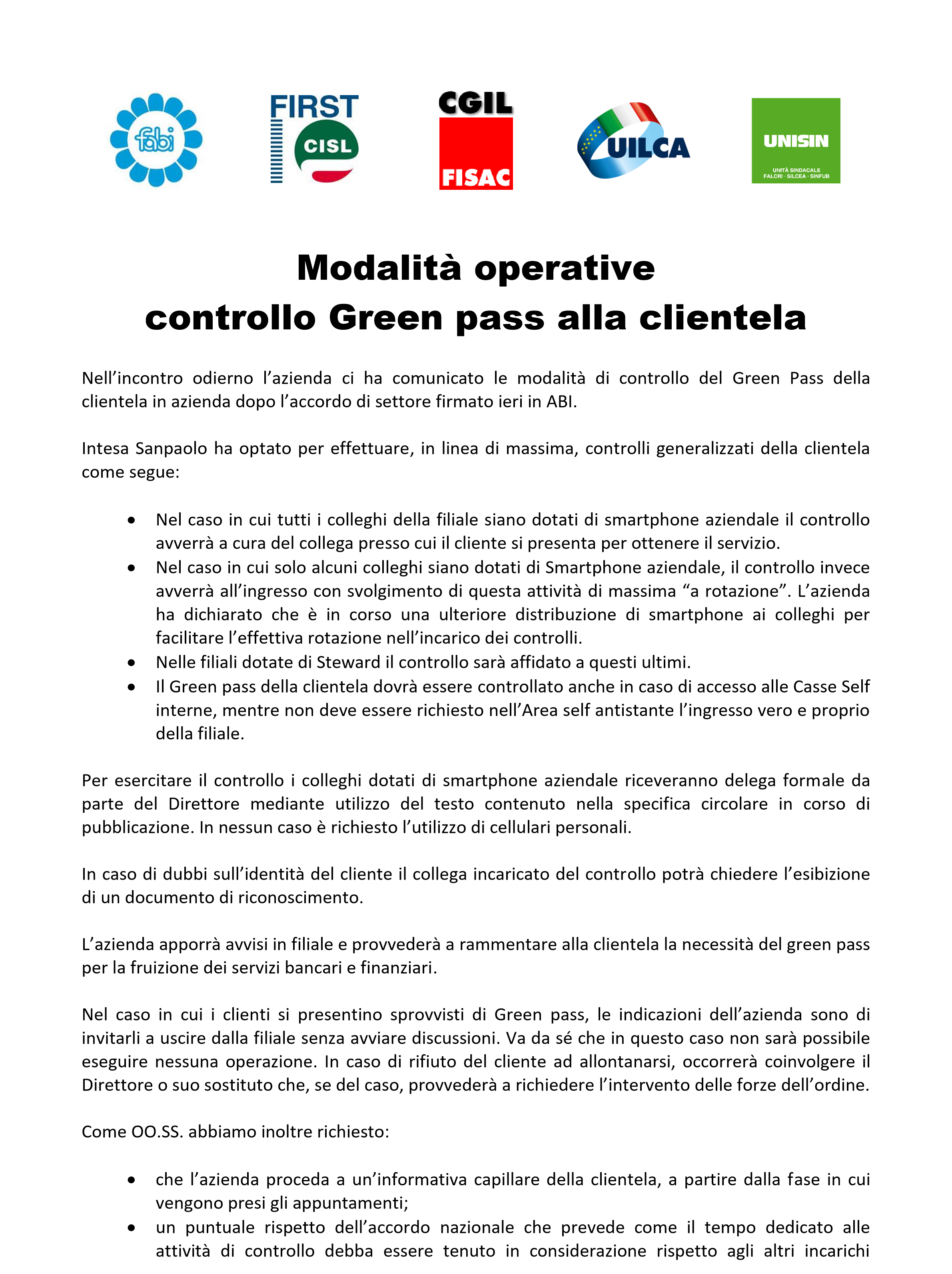 Milano, 28 gennaio 2022 Delegazioni Trattanti Gruppo Intesa Sanpaolo FABI - FIRST/CISL - FISAC/CGIL - UILCA - UNISIN