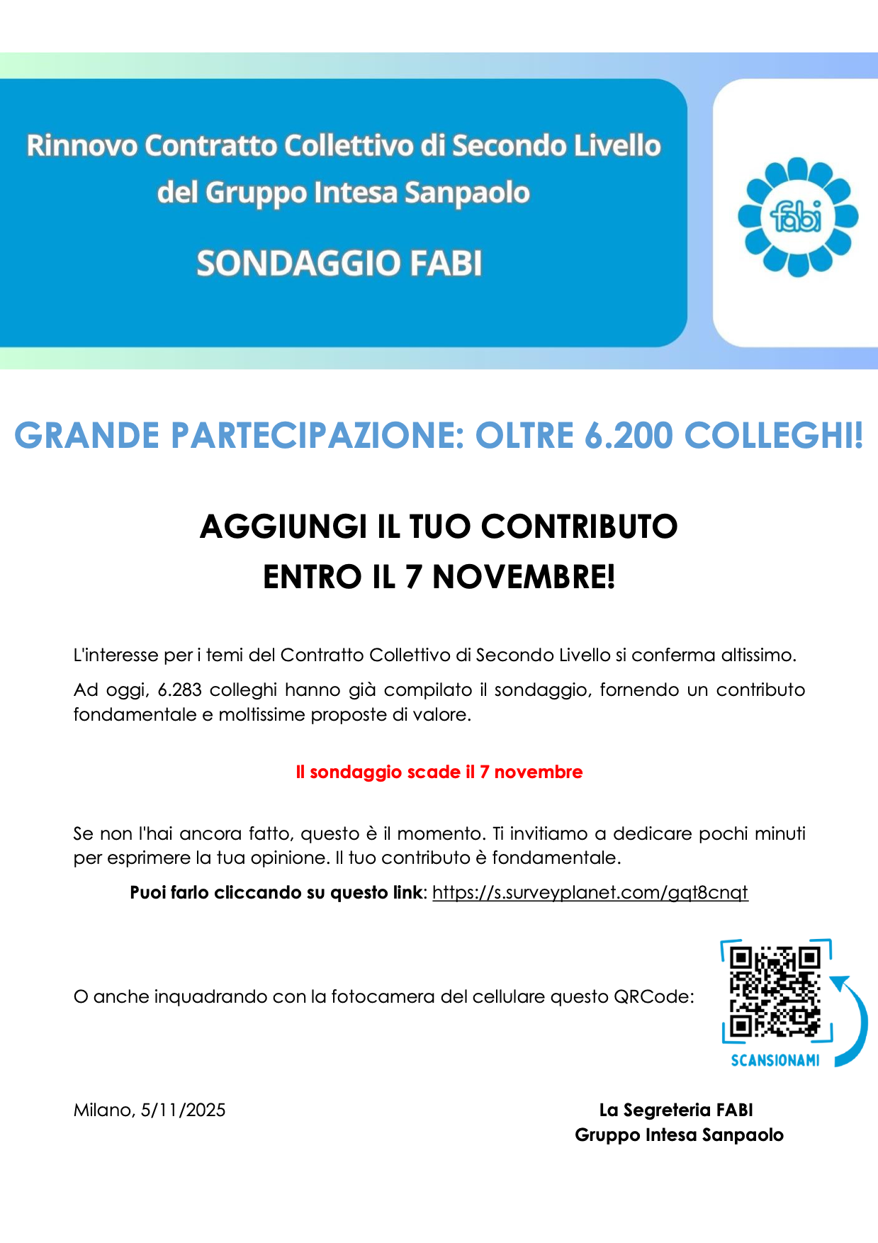 AGGIUNGI IL TUO CONTRIBUTO ENTRO IL 7 NOVEMBRE! Milano, 5/11/2025 La Segreteria FABI Gruppo Intesa Sanpaolo