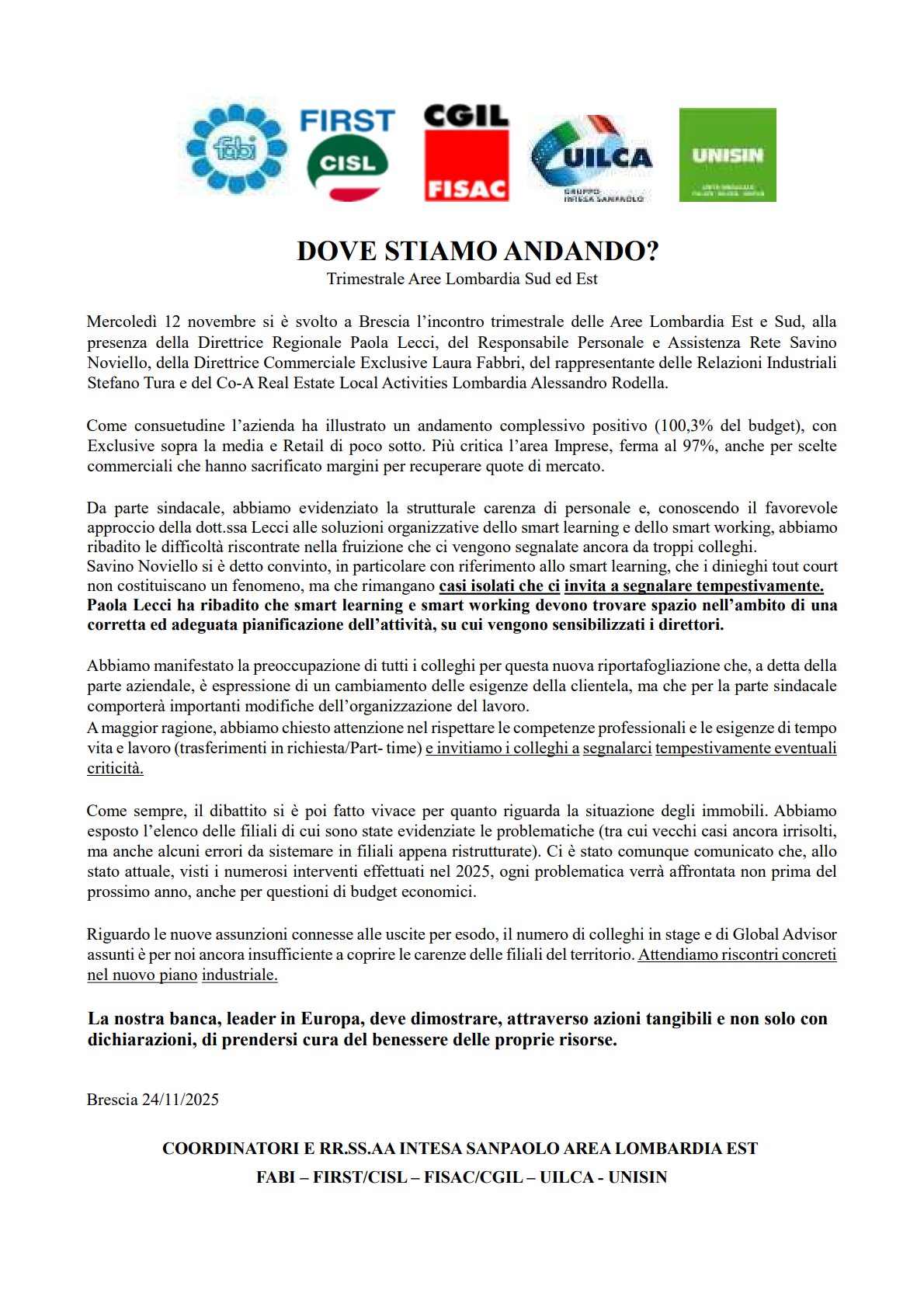 Brescia 24/11/2025 Trimestrale Aree Lombardia Sud ed Est COORDINATORI E RR.SS.AA INTESA SANPAOLO AREA LOMBARDIA EST FABI - FIRST/CISL - FISAC/CGIL ? UILCA - UNISIN
