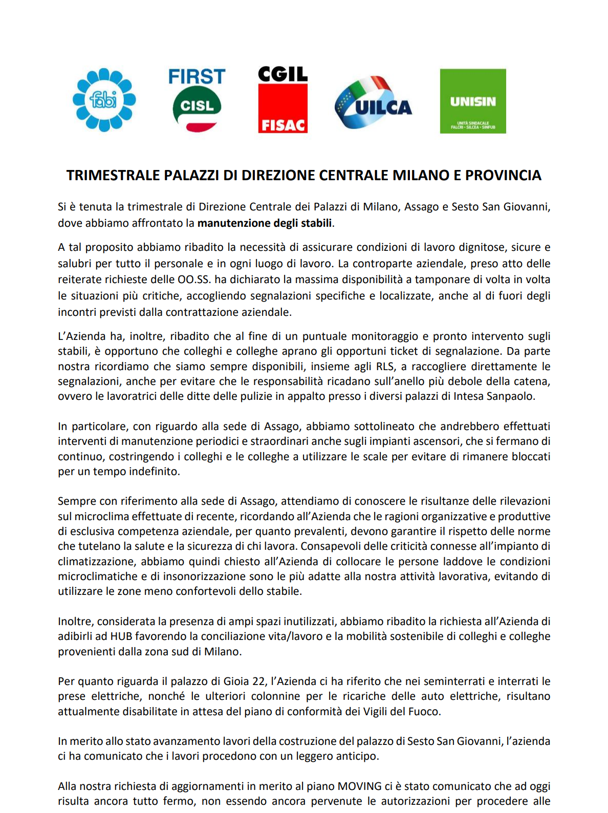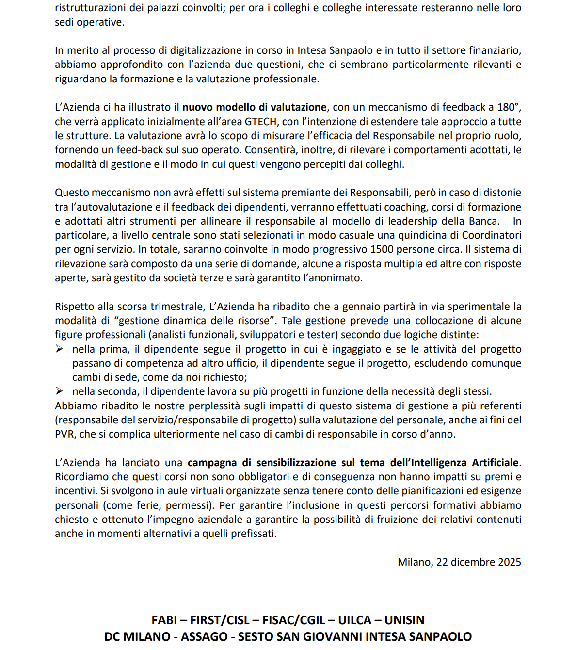 Milano, 22 dicembre 2025 FABI - FIRST/CISL - FISAC/CGIL - UILCA - UNISIN DC MILANO - ASSAGO - SESTO SAN GIOVANNI INTESA SANPAOLO