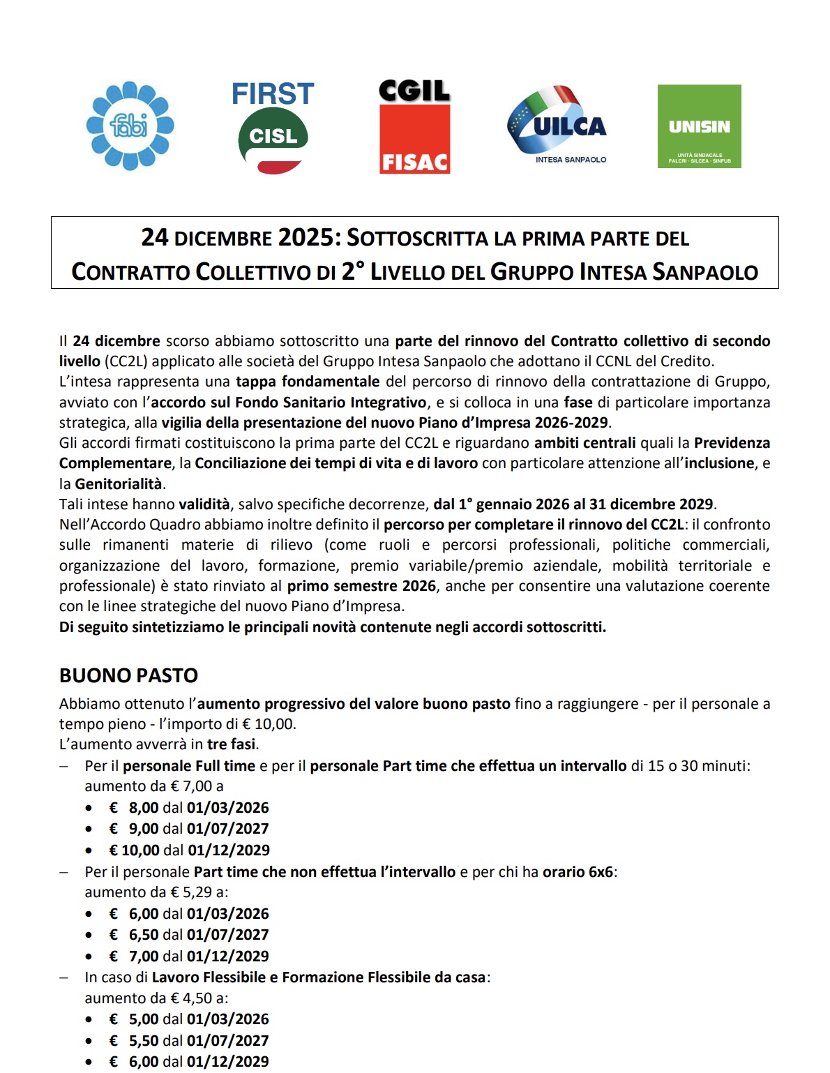 24 DICEMBRE 2025: SOTTOSCRITTA LA PRIMA PARTE DEL CONTRATTO COLLETTIVO DI 2 LIVELLO DEL GRUPPO INTESA SANPAOLO