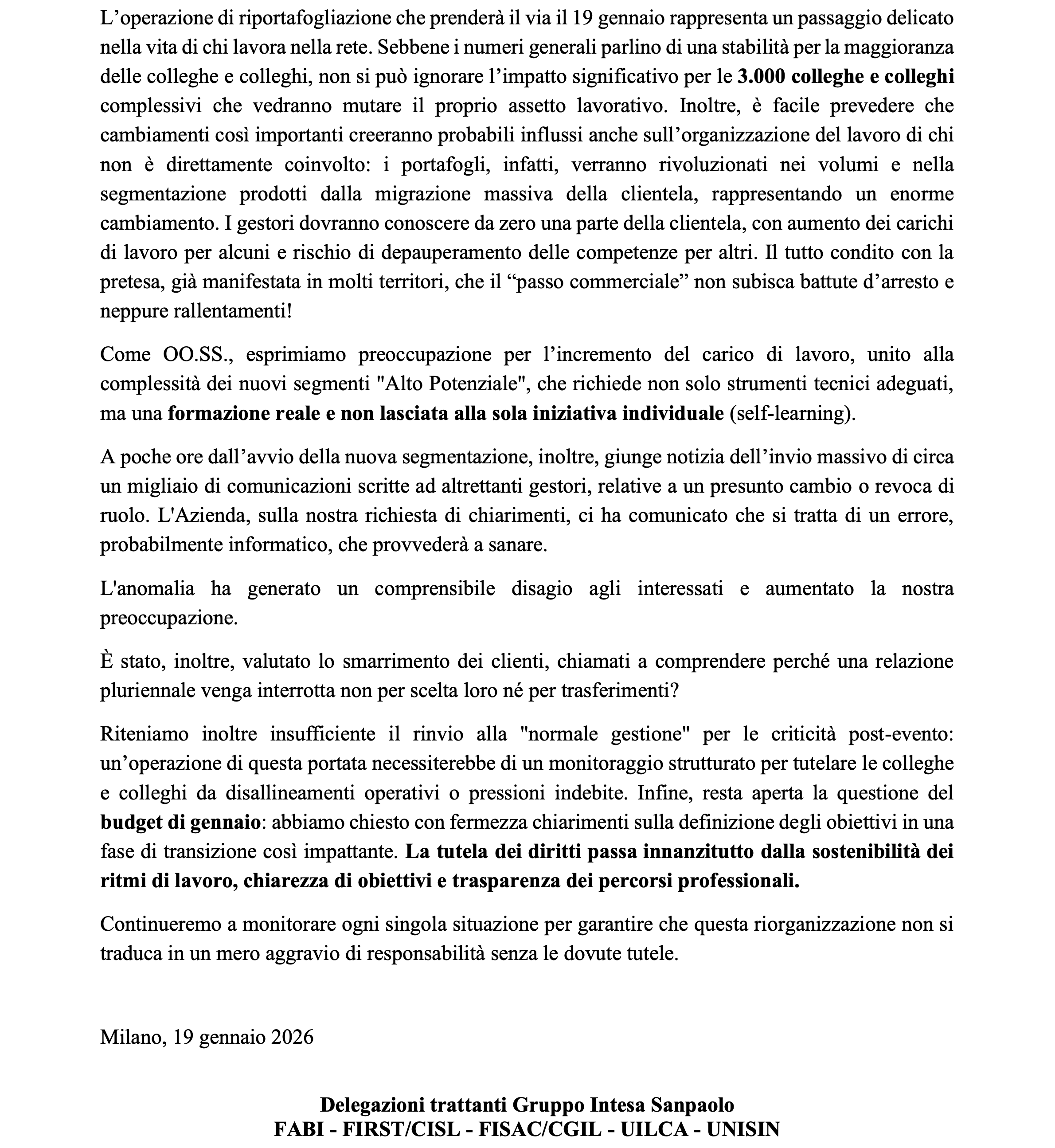 Milano, 19 gennaio 2026 Delegazioni trattanti Gruppo Intesa Sanpaolo FABI - FIRST/CISL - FISAC/CGIL - UILCA - UNISIN
