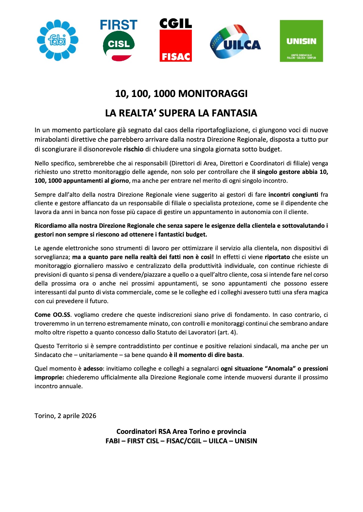 Torino, 2 aprile 2026 Coordinatori RSA Area Torino e provincia FABI - FIRST CISL - FISAC/CGIL - UILCA - UNISIN
