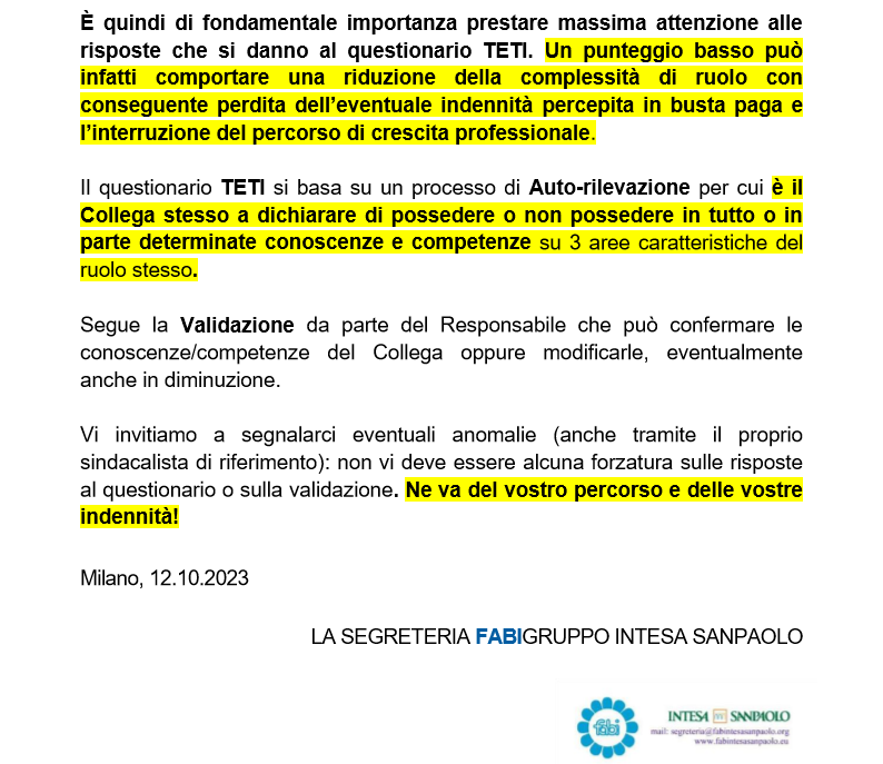 Milano, 12.10.2023 LA SEGRETERIA FABIGRUPPO INTESA SANPAOLO