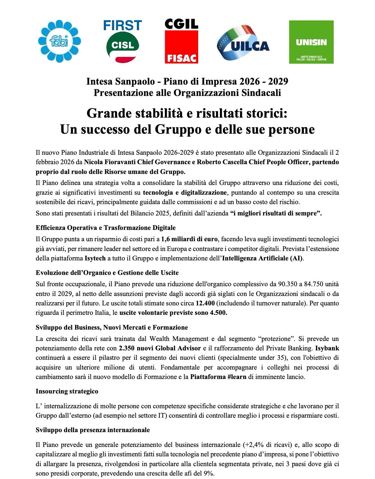Milano, 11 febbraio 2026 Delegazioni trattanti Gruppo Intesa Sanpaolo FABI - FIRST/CISL - FISAC/CGIL - UILCA - UNISIN