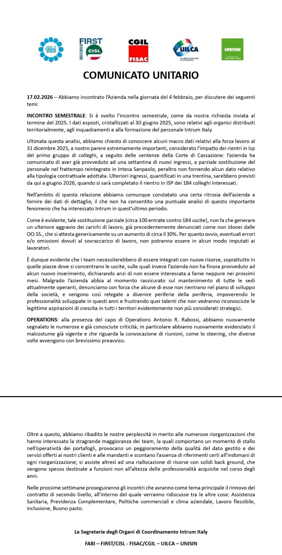 Le Segreterie degli Organi di Coordinamento Intrum Italy FABI - FIRST/CISL - FISAC/CGIL - UILCA - UNISIN