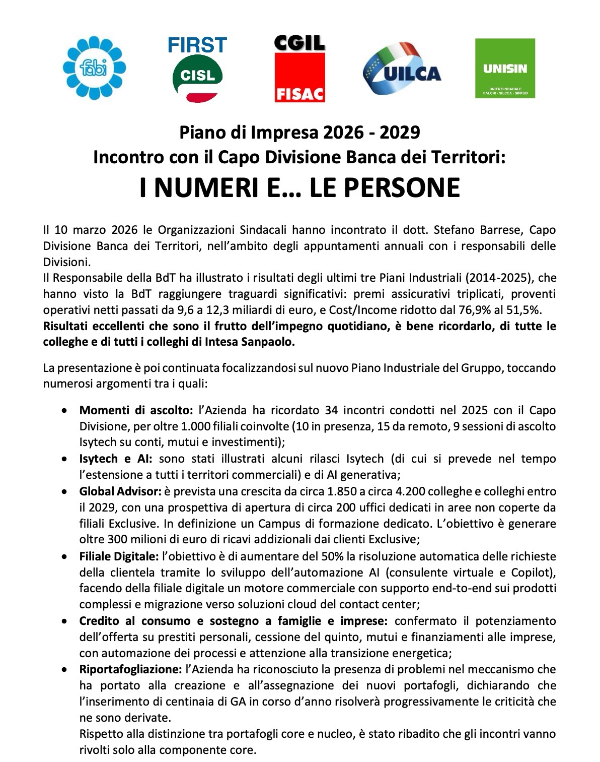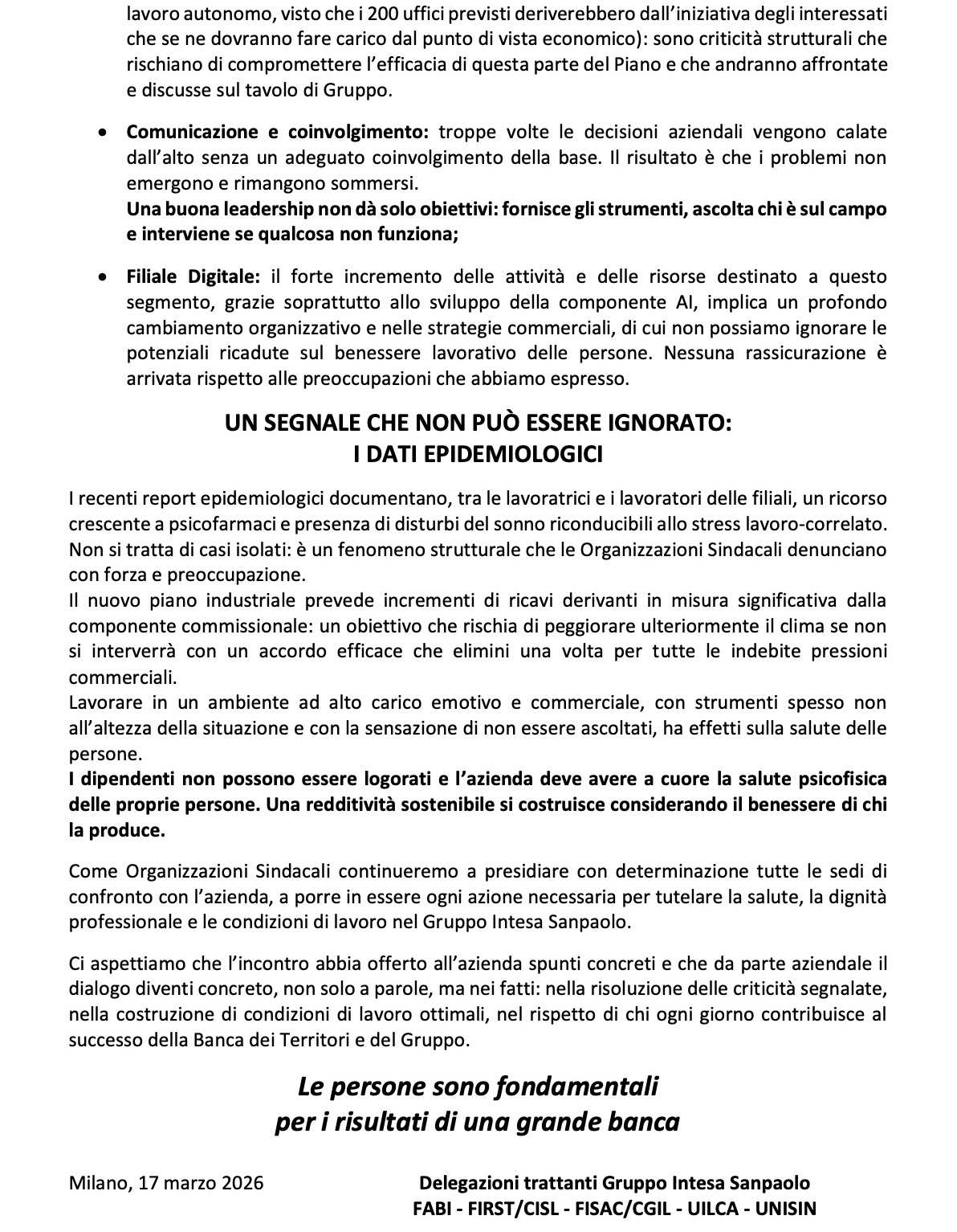 Milano, 17 marzo 2026 Delegazioni trattanti Gruppo Intesa Sanpaolo FABI - FIRST/CISL - FISAC/CGIL - UILCA - UNISIN