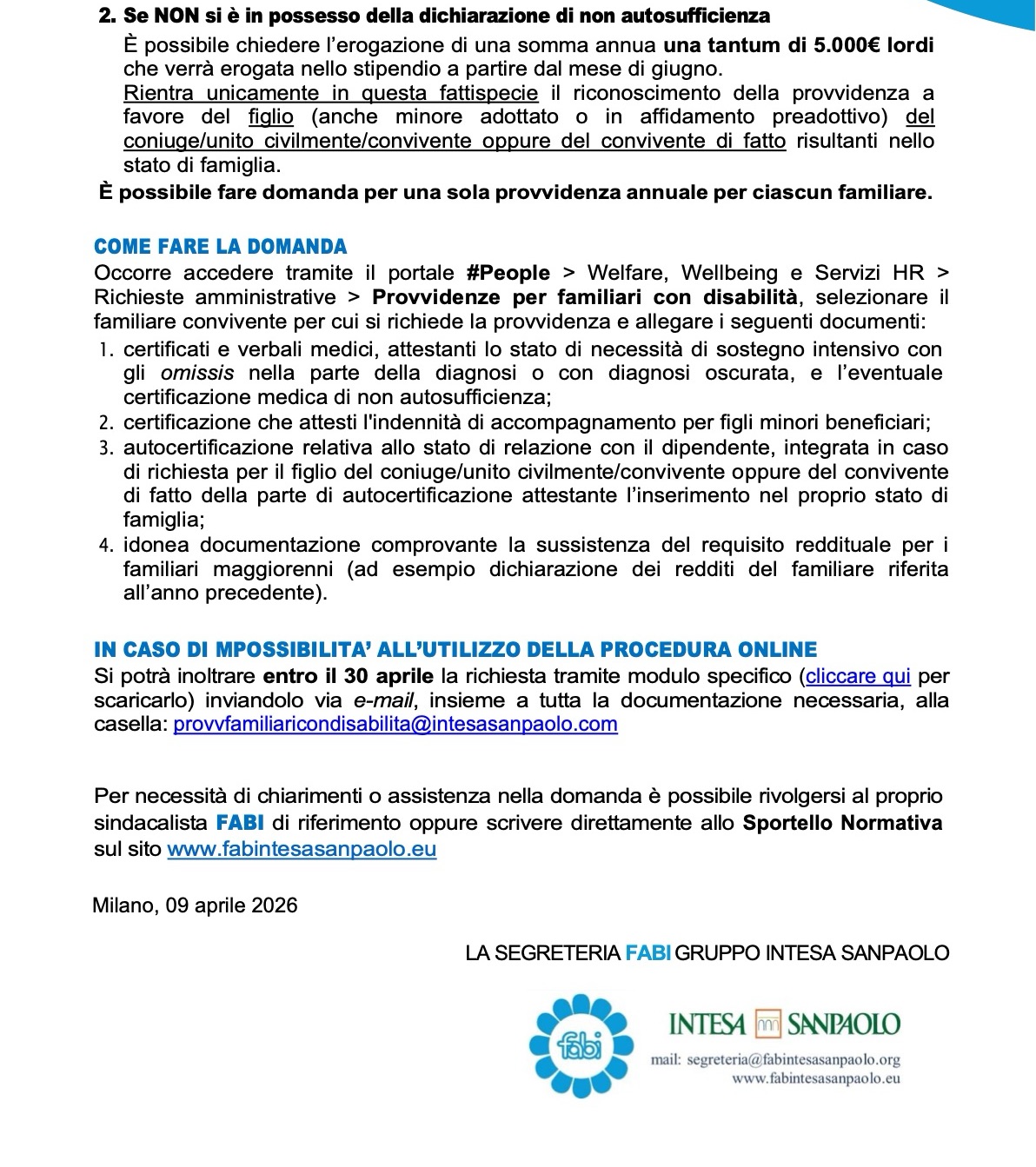Milano, 09 aprile 2026 LA SEGRETERIA FABI GRUPPO INTESA SANPAOLO