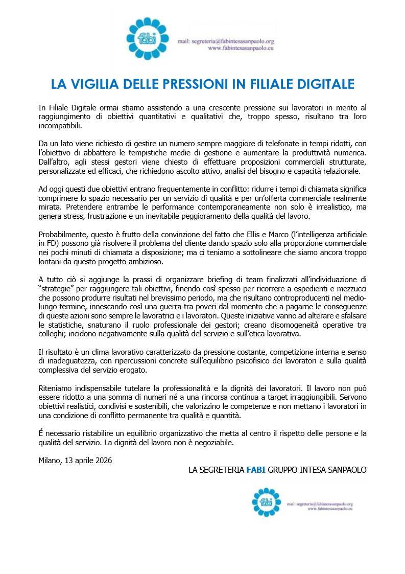 Milano, 13 aprile 2026 LA SEGRETERIA FABI GRUPPO INTESA SANPAOLO