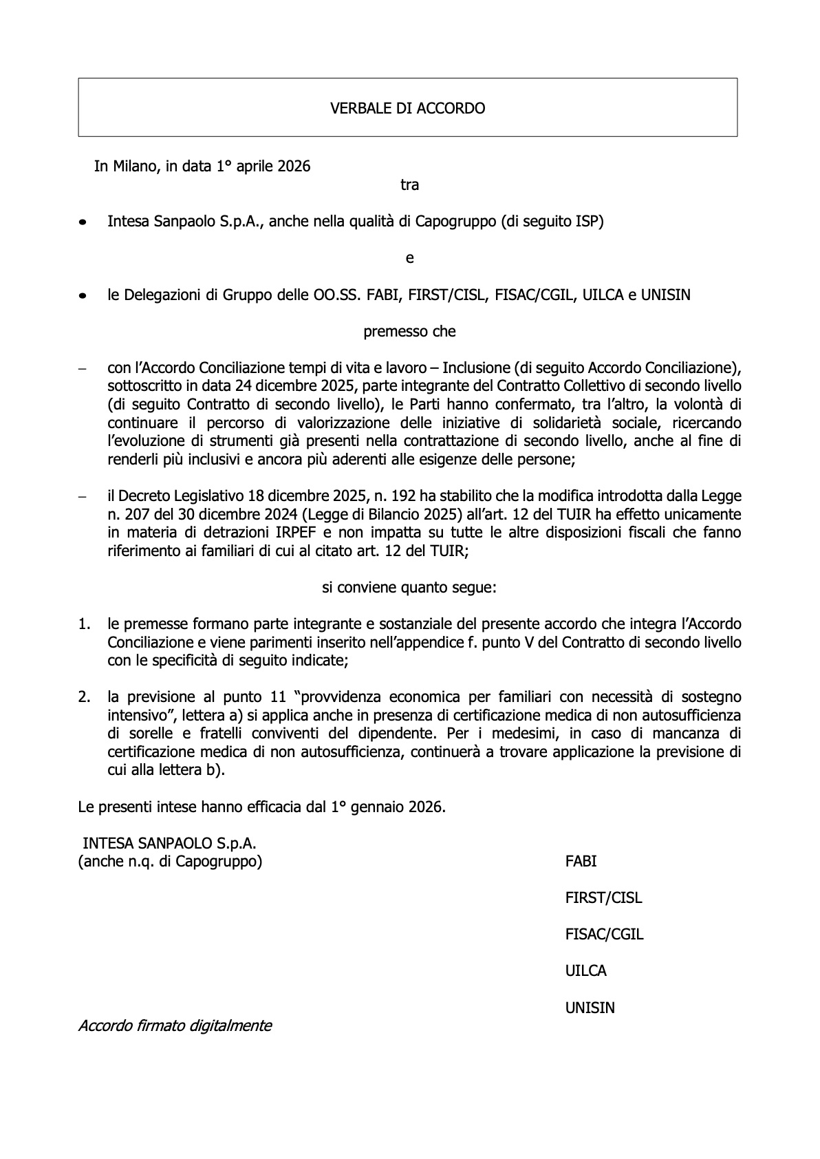 Accordo 1 aprile 2026 - integrazione all' accordo Conciliazione tempi di vita e lavoro - Inclusione sottoscritto in data 24 dicembre 2025, parte integrante del Contratto Collettivo di secondo livello (di seguito Contratto di secondo livello) sulla previsione del punto 11 ?provvidenza economica per familiari con necessità di sostegno intensivo?, lettera a) che si applica anche in presenza di certificazione medica di non autosufficienza di sorelle e fratelli conviventi del dipendente